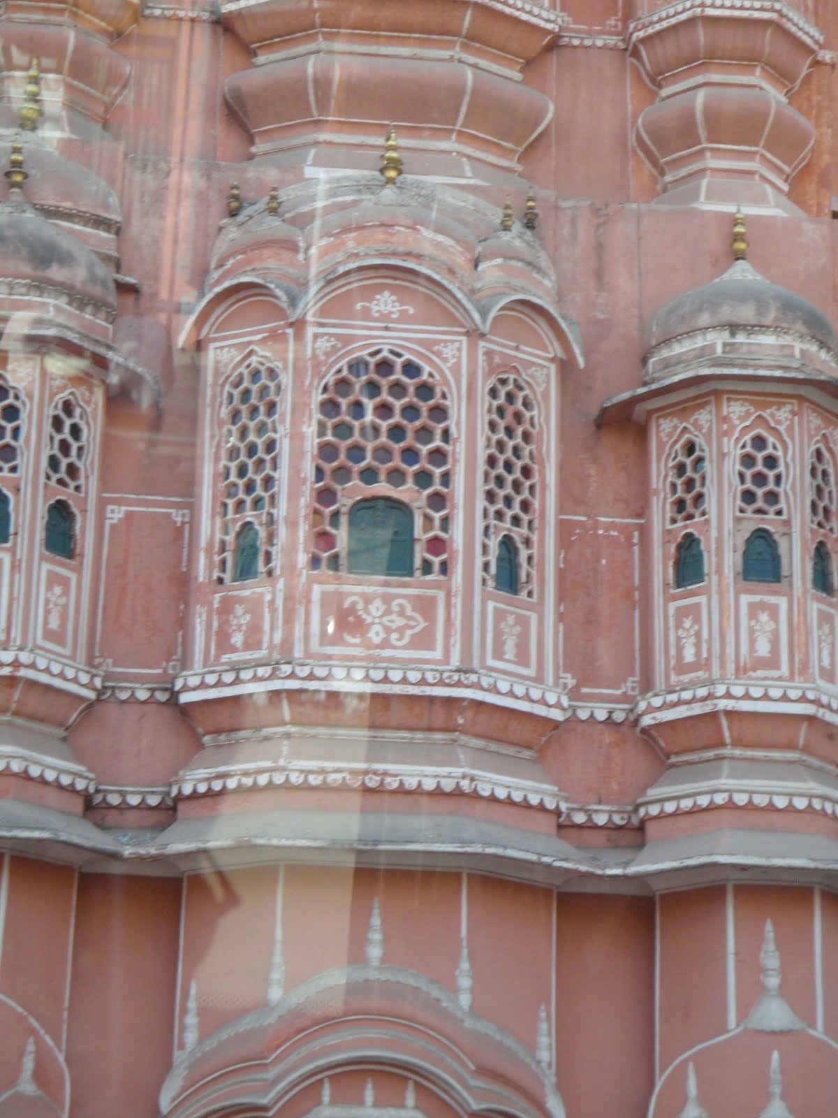 After lunch, we waited in the lobby until time to leave at 2:00. As predicted, our first stop was Agra Handicrafts. The staff treated us special; we even got the little elephant print from this morning’s block print demonstration. Several in the group bought items here. From there we went to the City Palace, the royal residence of the Maharajah of Jaipur. Inside we saw several elaborate costumes as well as some huge silver jars used by the Maharajah to carry Ganges water with him to London for the coronation of King George V in 1902. We enjoyed seeing the museum portion of the palace and the exterior of the portion where the royalty currently resides.