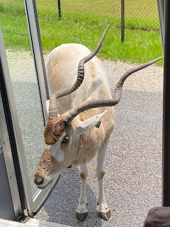 Several residents of The Conservatory in Keller Town Center took a trip in the community bus to Fossil Rim Wildlife Center in Glen Rose. Although storms were in the forecast and we drove through one on the way there, we had an enjoyable day with only a short rain shower while inside the park. We ate lunch at the Overlook Cafe about half way through the drive. Some pellets are given to offer as food to the animals, and one ate spilled pellets from the steps inside the bus door. What an enjoyable day we experienced!